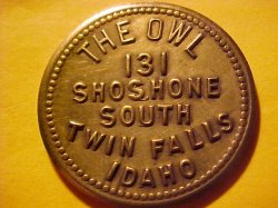 Twin Falls, Idaho THE OWL 131 SHOSHONE SOUTH 25c Token Token reads: THE OWL/ 131/ SHOSHONE/ SOUTH/ TWIN FALLS/ IDAHO REVERSE: GOOD FOR/ 25c/ IN TRADE 26mm or 1" in diameter. Good Condition. Round Brass. If you have any questions, do not hesitate to email me. I work hard to earn your satisfaction, pack well and ship promptly. The Shipping & Handling charge on this item is: FREE/ NO CHARGE. Personal Checks/ Money Orders/ PayPal accepted. Thank You For Looking!!
