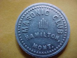 Hamilton, Montana MASONIC CLUB 5c Token Token reads: MASONIC CLUB/ ||||/ HAMILTON,/ MONT. GOOD FOR/ * 5c */ IN TRADE 21mm or 13/16" in diameter. Good Condition. Round Aluminum. If you have any questions, do not hesitate to email me. I work hard to earn your satisfaction, pack well, ship as soon as payment is confirmed and try to keen shipping and handling costs to a minimum. The Shipping & Handling charge on this item is: FREE/ NO CHARGE. Thank You For Looking!!