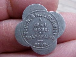 TOKEN READS: T. C. H. & H. J. SCHMIDT / * / GEN'L / MDSE. / - · - / VALPARAISO, / — / NEBR. REVERSE: GOOD FOR / ~ 5¢ ~ / IN TRADE 24mm or 15/16" in diameter, 4 Scallops, Good, Aluminum The Shipping & Handling charge on this item is: FREE / NO CHARGE. Thank You For Looking!!!