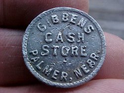 TOKEN READS: GIBBENS / CASH / STORE / PALMER, NEBR. REVERSE: GOOD FOR ¢ 5 ¢ / IN TRADE 20mm or 13/16" in diameter, Round, Good / Dug / Dings, Aluminum If you have any questions, do not hesitate to email me. I work hard to earn your satisfaction, pack well and ship promptly. The Shipping & Handling charge on this item is: FREE / NO CHARGE. Thank You For Looking!!!