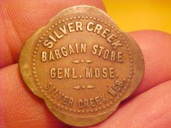 Silver Creek, Nebraska Token: SILVER CREEK BARGAIN STORE 25¢ general store TOKEN READS: SILVER CREEK / BARGAIN STORE / ◄♦► / GENL. MDSE. / ◄♦► / SILVER CREEK, NEB. REVERSE: GOOD FOR / 25¢ / IN MERCHANDISE 28.5mm or 1 1/8" in diameter, Good Condition, 4 Scallops, Brass This token is listed in Silver Creek in the Nebraska Trade Tokens book published by the Nebraska Token Collectors Club. Thank You For Looking!!!