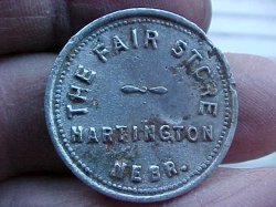 Hartington, Nebraska Token: THE FAIR STORE 50¢ TOKEN READS: THE FAIR STORE / ►c◄ / HARTINGTON / NEBR. REVERSE: GOOD FOR / 50¢ / IN / MERCHANDISE 28mm or 1 1/8" in diameter, Round, Good Condition / Dug, Aluminum This token is listed in Hartington in the Nebraska Trade Tokens book published by the Nebraska Token Collectors Club. Thank You For Looking!!!