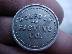 Norfolk, (Nebraska) Token: NORFOLK PACKING CO. 4 HUSKERS CHECK NORFOLK, (NEBRASKA) TOKEN READS: NORFOLK / ♦•♦ / PACKING / CO. REVERSE: HUSKERS / 4 / CHECK 22mm or 7/8" in diameter, Round, Good Condition, Aluminum The Norfolk Packing Co. operated in Norfolk, Nebraska from 1913 to 1940. Thank You For Looking!!!