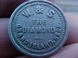 TOKEN READS: W. & S. / THE / DIAMOND / •-• / GRAND ISLAND, NEBR. REVERSE: GOOD FOR / 5¢ / IN / MERCHANDISE 21mm or 13/16" in diameter, Round, Good Condition, Aluminum This token is listed in Grand Island in the Nebraska Trade Tokens book published by the Nebraska Token Collectors Club. Thank You For Looking!!!