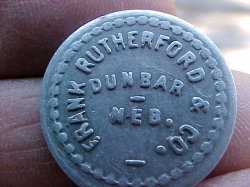 TOKEN READS: FRANK RUTHERFORD & CO. / DUNBAR / - / NEB. / - REVERSE: GOOD FOR / 10 / IN TRADE 22mm or 7/8" in diameter, Round, Good Condition, Aluminum This token is listed in Dunbar in the Nebraska Trade Tokens book published by the Nebraska Token Collectors Club. Thank You For Looking!!!
