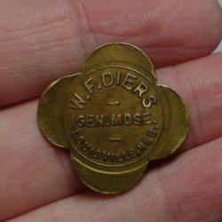 TOKEN READS: W. F. DIERS / - / GEN. MDSE. / - /LOUISVILLE, NEB. REVERSE: GOOD FOR / 5¢ / IN TRADE 23.5mm in diameter, 4 Scallops , Good Condition, Brass Thank You For Looking!!!