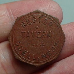 Odell, Nebraska Token: NESTOR TAVERN 10¢ TOKEN READS: NESTOR / TAVERN / ODELL, NEBR REVERSE: GOOD FOR / 10¢ / IN TRADE; red fiber octagon 23mm, red fiber, octagon.
