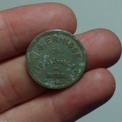 TOKEN READS: J. S. ERNISSE / LOUISVILLE, / NEBR. / REVERSE: GOOD FOR / 5~ / IN TRADE 21mm, round, aluminum
